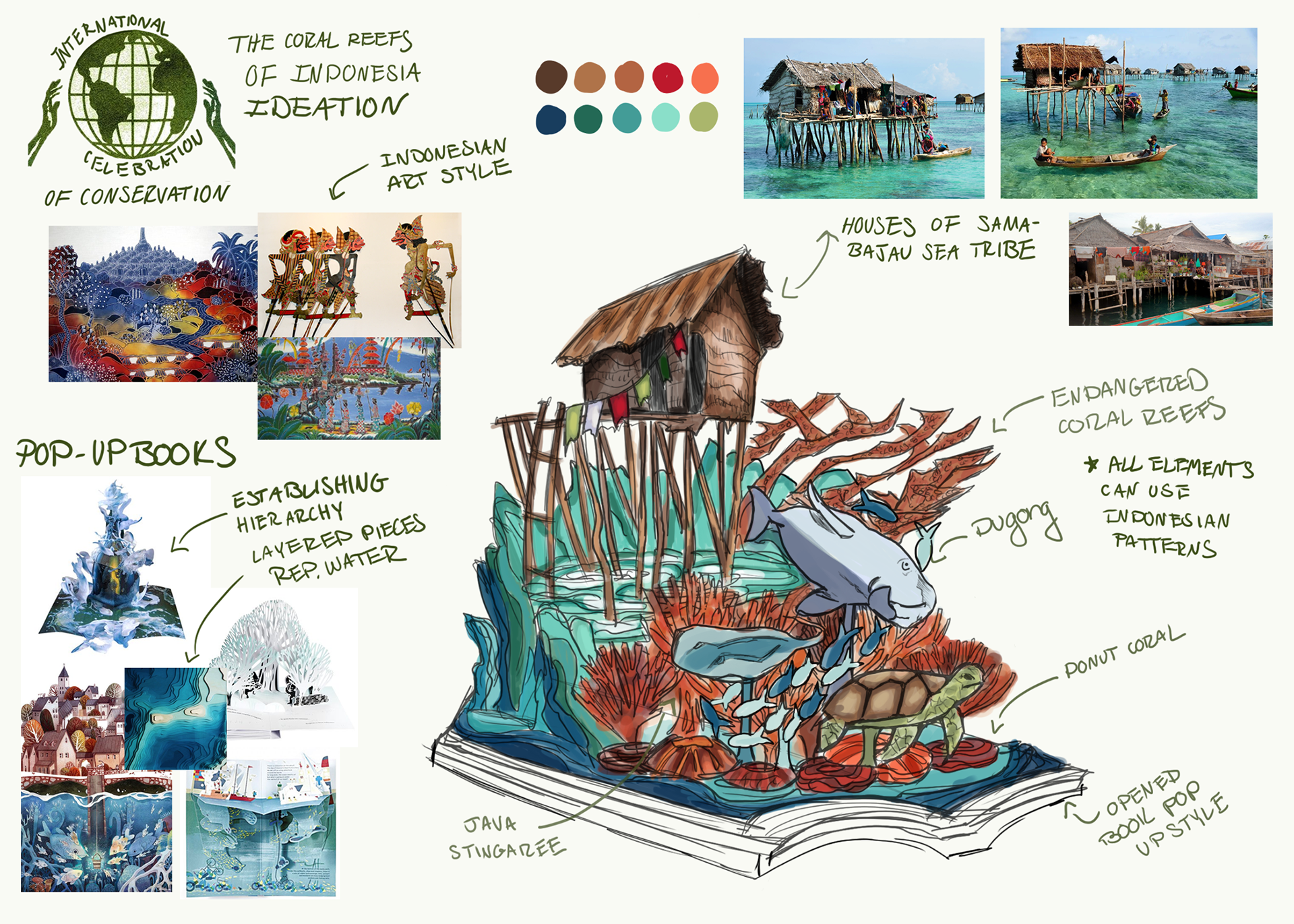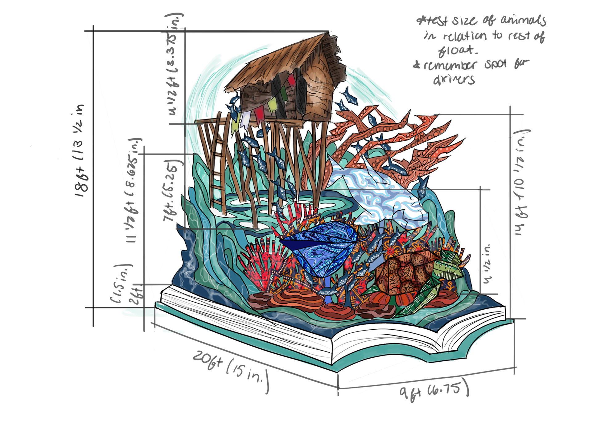 For this float, we primarily focused on the vulnerable coral reefs and sea creatures located in the Southeast Asia waters of Indonesia. Taking heavy reference from their history and culture, I translated common colors, textures, and materials of their homes and people to draft this concept.