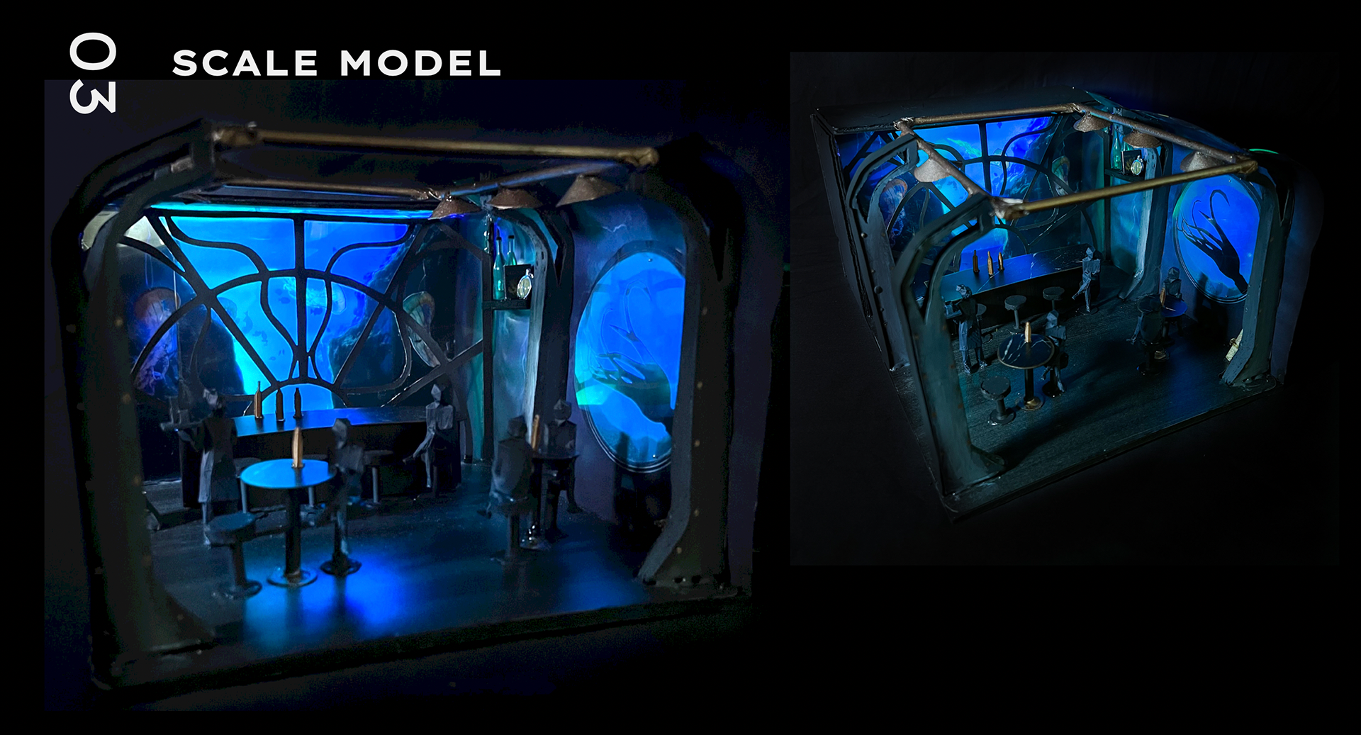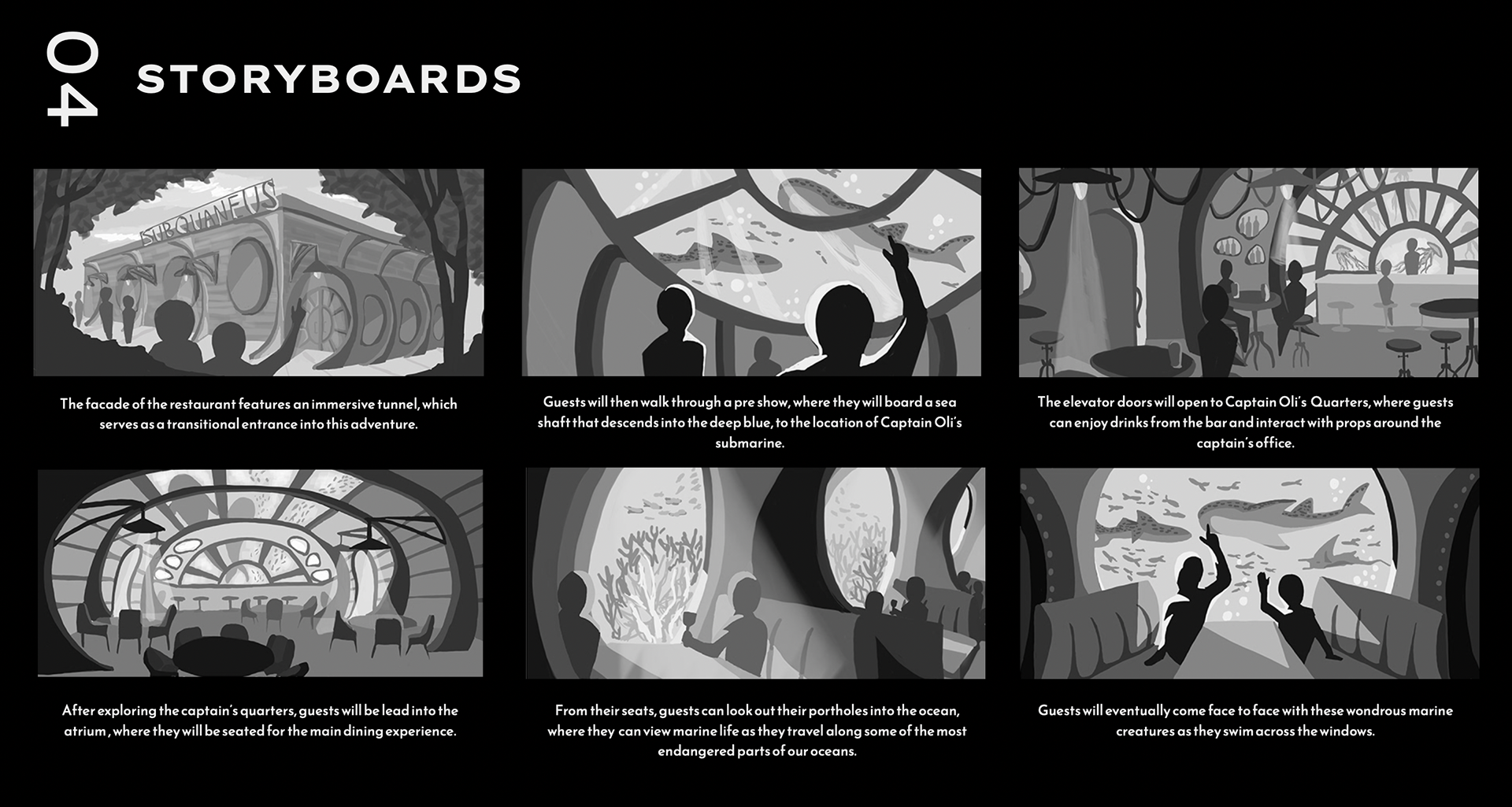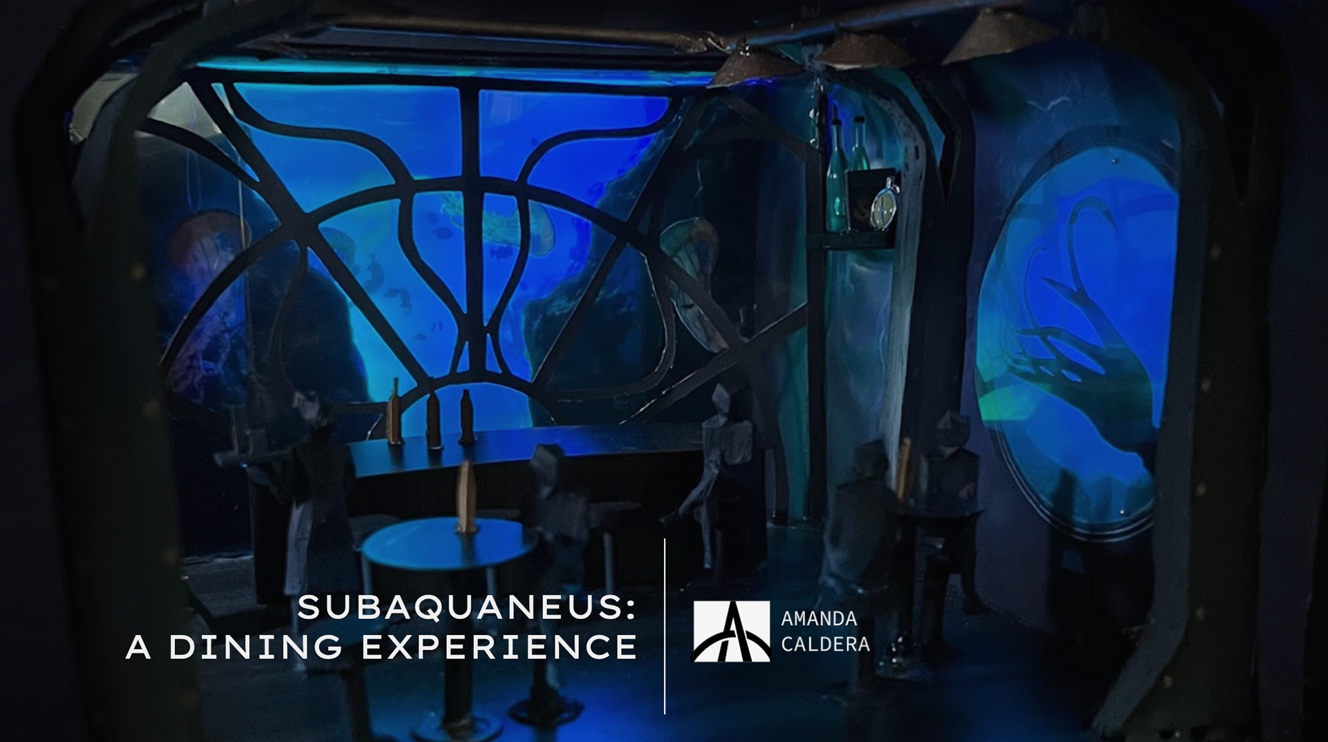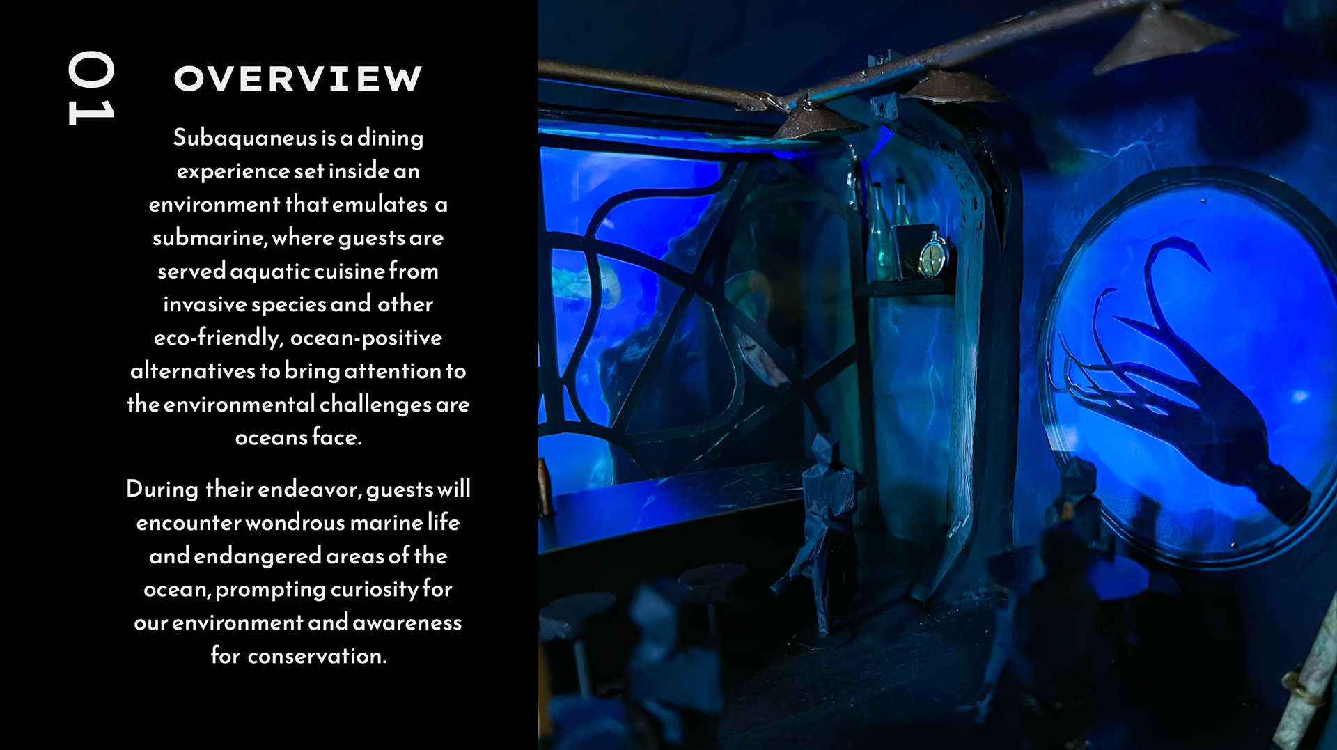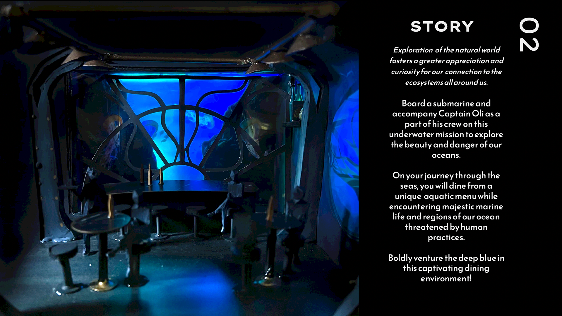 Subaquaneus is a blue sky pitch of a dining experience set inside an environment emulating a submarine, where guests are served aquatic cuisine from invasive species and other eco-friendly, ocean-positive